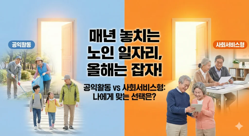 공익활동은 “시간 짧고 부담 낮게”, 사회서비스형(역량활용)은 “시간 더 길고 서비스 제공 중심”입니다. 내 체력·원하는 역할을 먼저 정하면 선택이 빨라집니다.