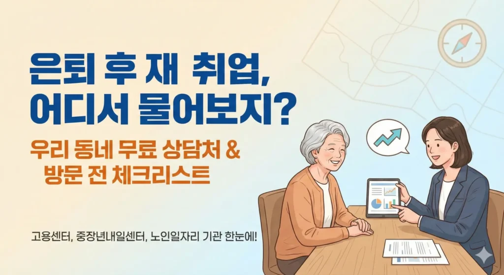 은퇴 후 재취업에서 가장 아쉬운 순간은 “상담받을 곳을 몰라서 시간이 지나버리는 것”입니다. 우리 동네에서 접근하기 쉬운 곳 1곳을 오늘 확정하고, 방문 전에 10분만 준비하면 됩니다.